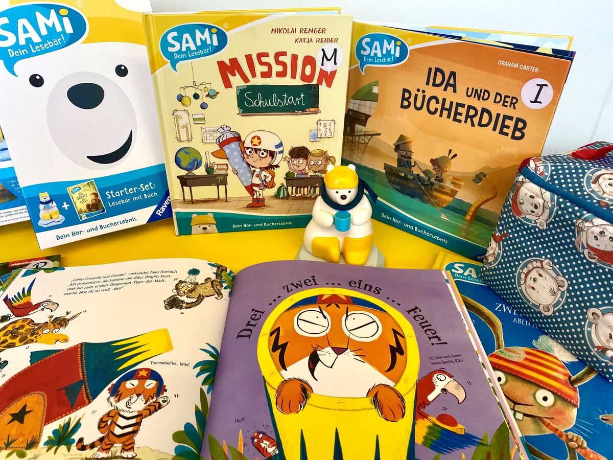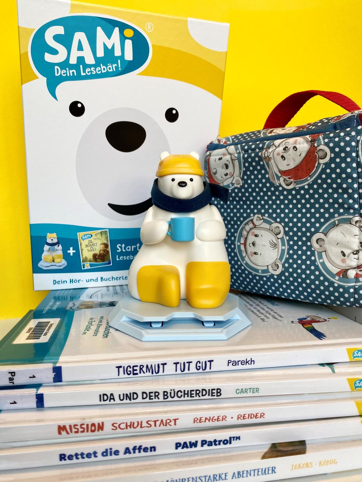SAMi wird einfach an eine markierte Stelle am Buchrücken gesteckt und liest den Kindern dann die Geschichte Seite für Seite vor. Dabei entscheiden die Kinder durch Umblättern, wann was gelesen werden soll. Im Gegensatz zu Hörbuch und Toniebox bleibt also der Bezug zum Medium Buch erhalten und auch ein gleichzeitiges Mitlesen ist so möglich. Das ist auch für Lese- und Sprachanfänger praktisch!
